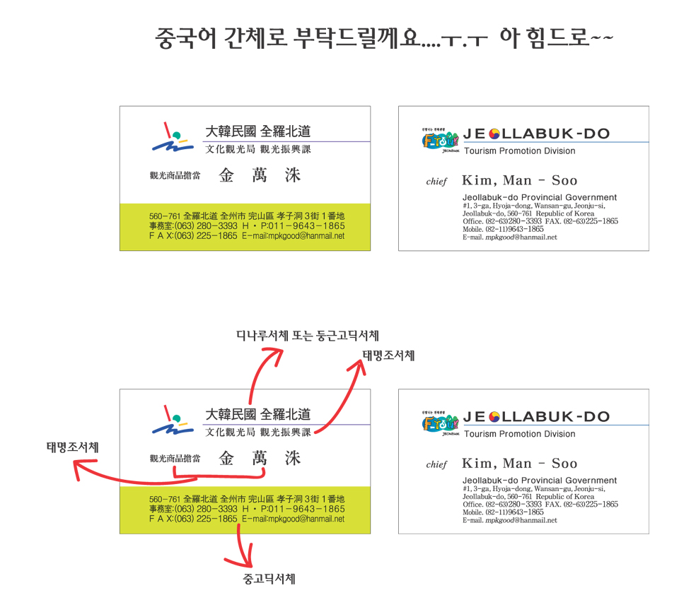 중국어 간체로 명함글씨 아웃라인 부탁드려요...ㅜ.ㅜ 혀리 일반 0 7090 2007.02.06 19:47 -0001.11.30 00:00 jj.ai (0byte) + 34 아무리 방법을 모색해도 할수가 없네요... 오늘 인쇄해야하는데..ㅜ.ㅜ 염치불구하고 올려봅니다...부탁드릴께요...ㅜ.ㅜ